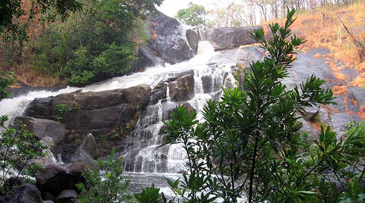 Meenmutty Falls is a waterfall located 35 kilometres from Vrindavanam Convention Centre, palode in Thiruvananthapuram District in the Indian state of Kerala, India. The falls are located near the Neyyar Reservoir area. No transportation is available so visitors have to trek 2km through the dense forests to reach the falls. It is very beautiful fall with beautiful surroundings. The Kombaikani Falls lie 2 kilometres (1.2 mi) upstream of the Meenmutti Falls on the trek path to Agastyakoodam.